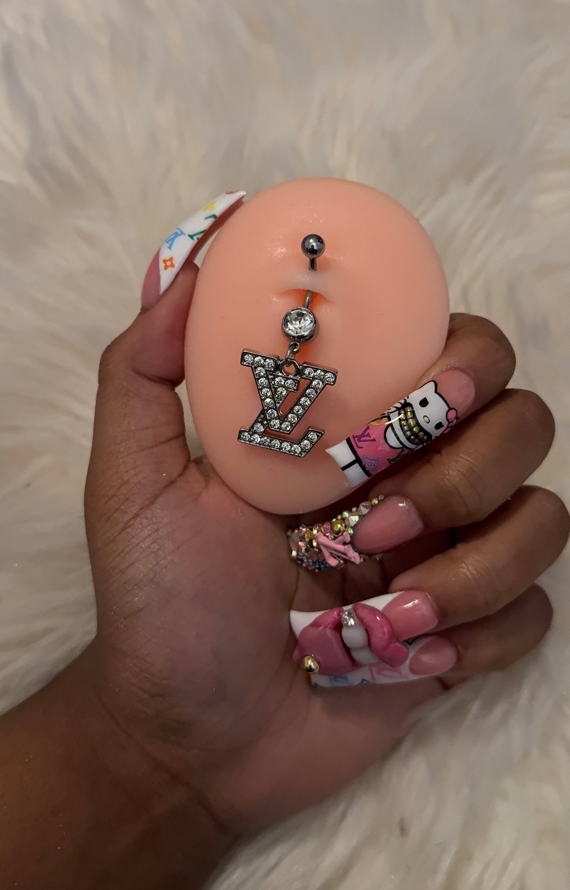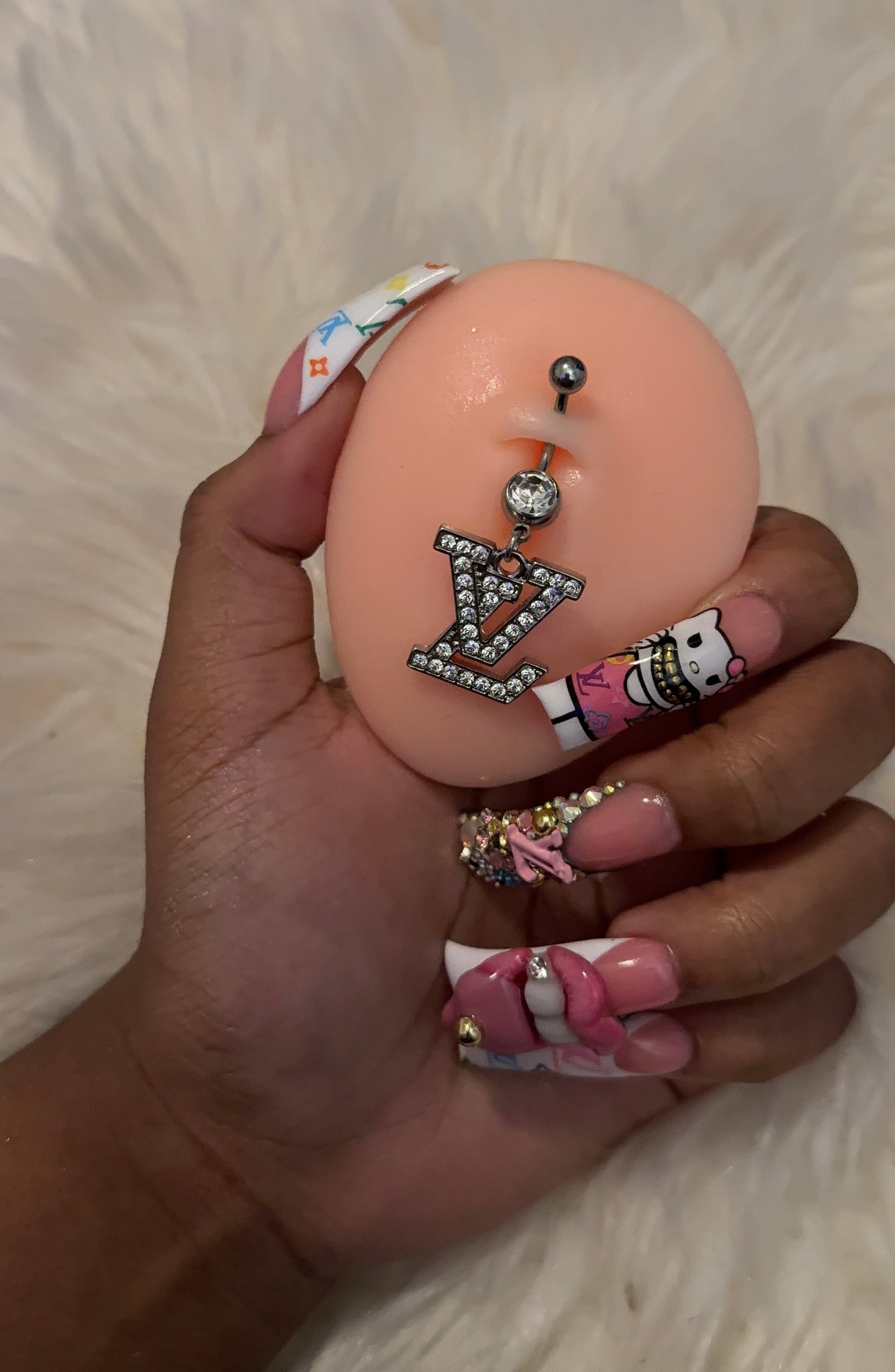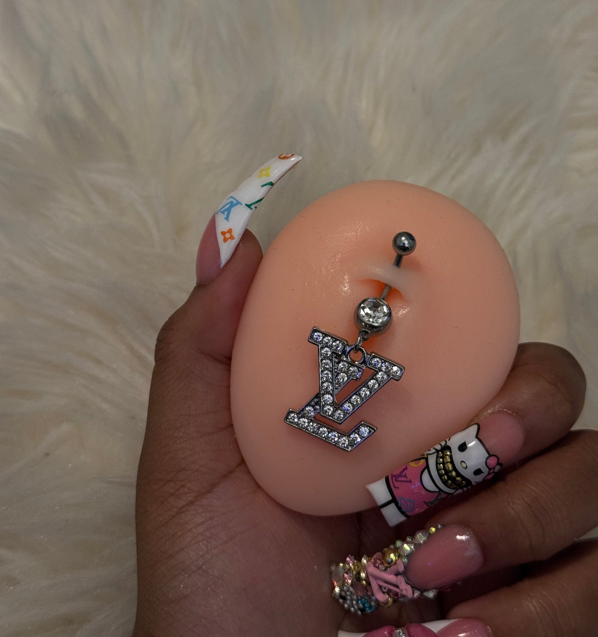 A bold statement belly ring made for the girls who love luxury inspired pieces. This design features a large LV style charm with crystal detailing that catches the light perfectly. Eye catching, glam, and perfect for showing off your waist with confidence.