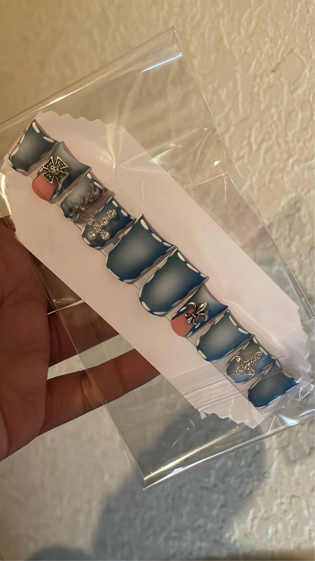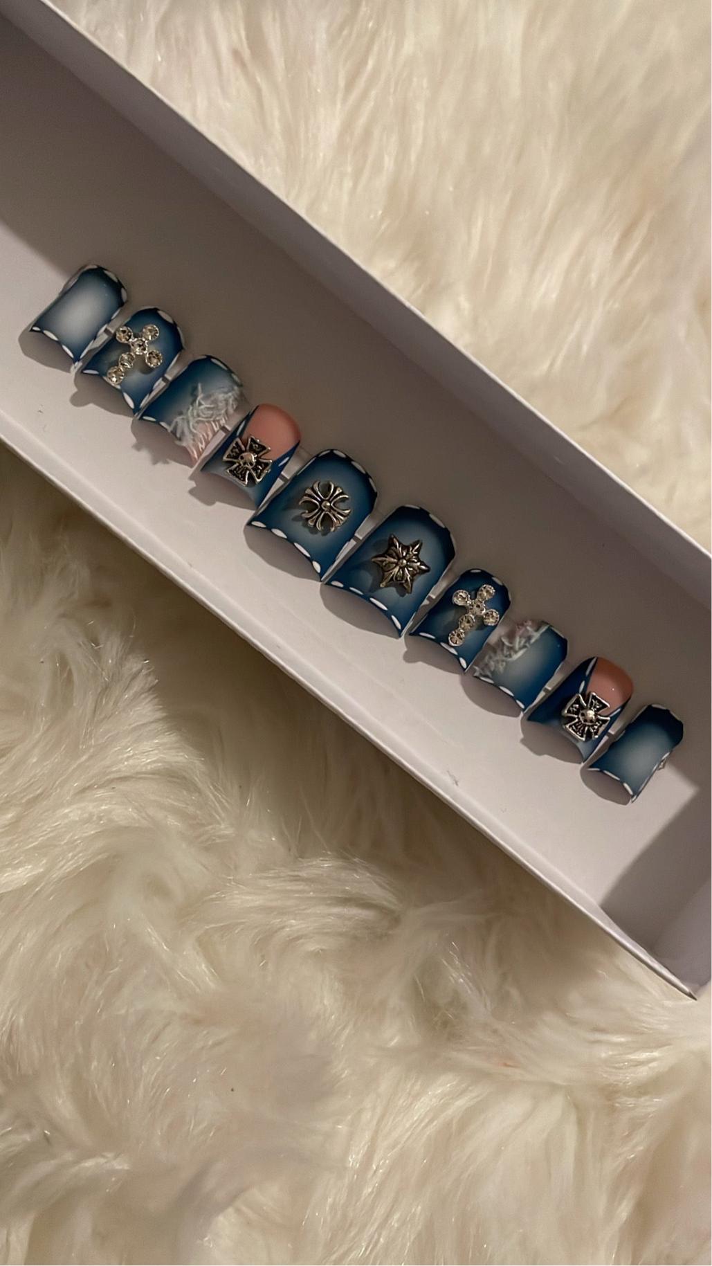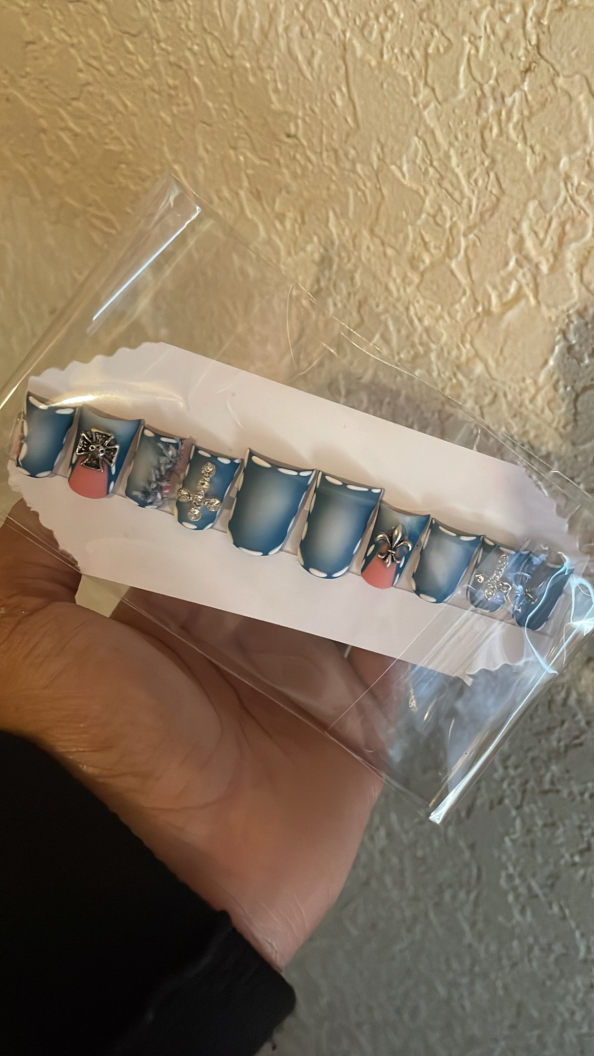This fierce and edgy nail set brings denim to your fingertips literally. Featuring a rich dark denim blue base, nails designed with REAL 3D jean texture. The details are elevated with faux stitching, and texture that looks and feels like true denim. To bring out the bold energy, the set includes stunning silver and diamond cross embellishments that add the perfect touch of glam and grit. These sparkling crosses stand out against the denim backdrop, catching light with every movement and adding a luxurious yet rebellious vibe.