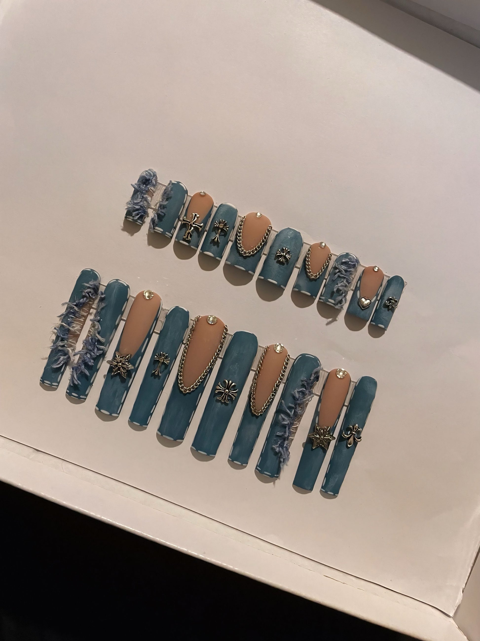 Our “Denim” 10pc Acrylic Set, bring bold fashion to your fingertips with our “denim” Nail Set! This 10-piece set features a unique 3D denim inspired design, detailed with eye catching charms and edgy chain accents. Each nail is handcrafted for a statement look that blends streetwear vibes with glam. Perfect for anyone who loves to stand out. no two sets are exactly the same🥰.