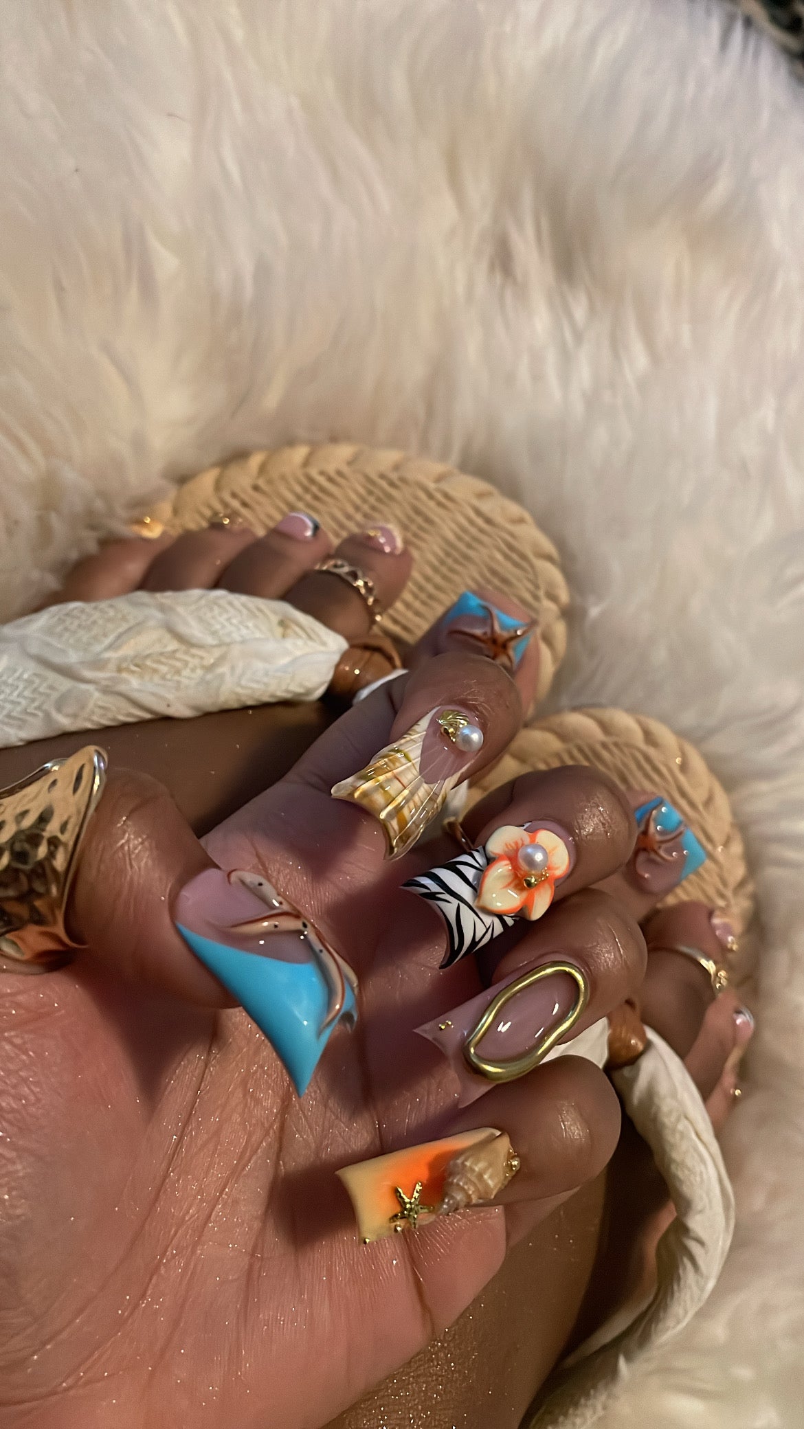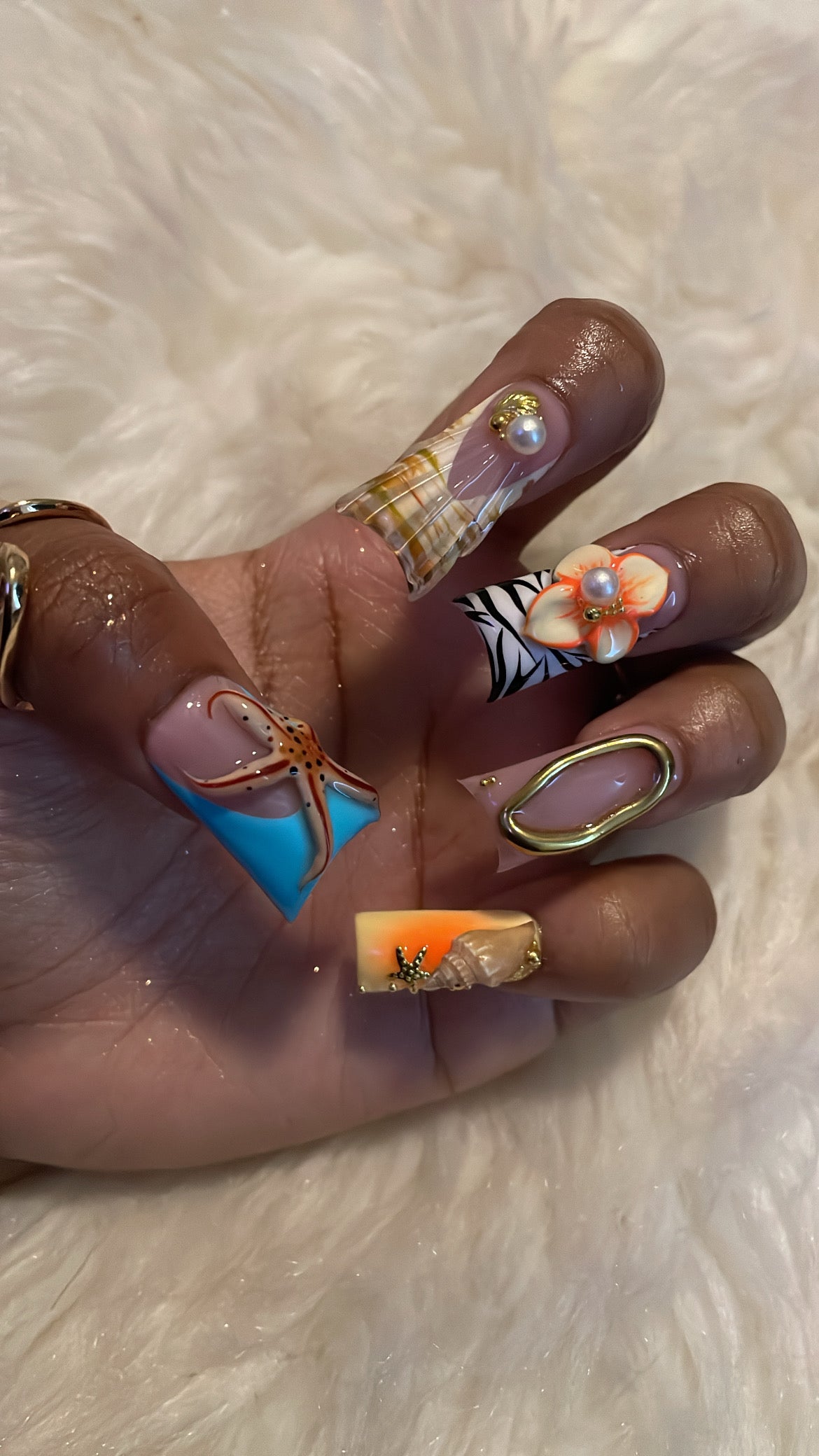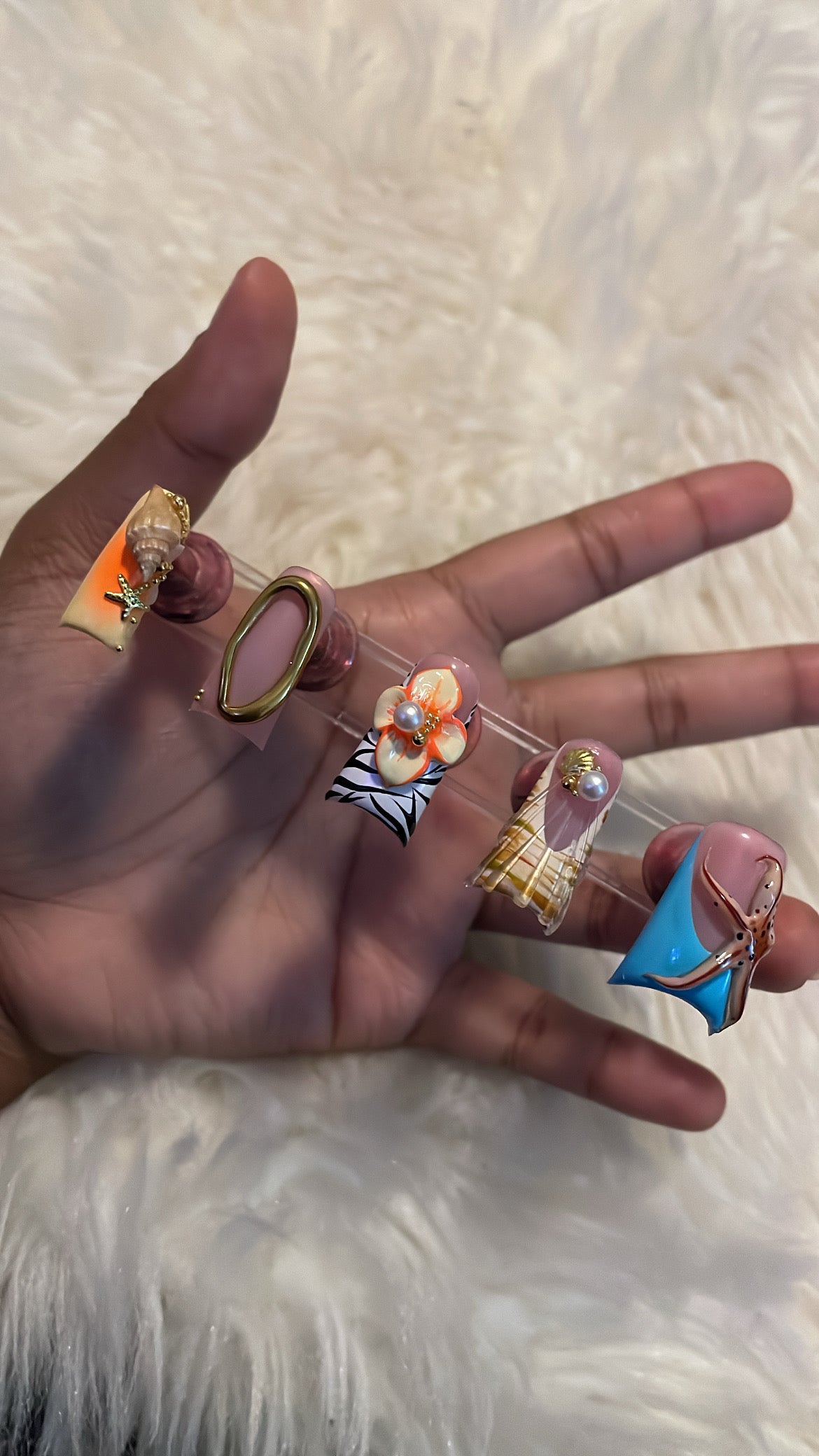 Get ready to escape with the Rode Trip nail set your passport to paradise! This vibrant, tropical inspired freestyle set features a mix of bright colors, zebra print accents, and shimmering gold accessories that channel beachside glam. Each nail is uniquely decorated with 3D starfish, seashells, and luxe tropical charm pieces, bringing major island vibes wherever you go.