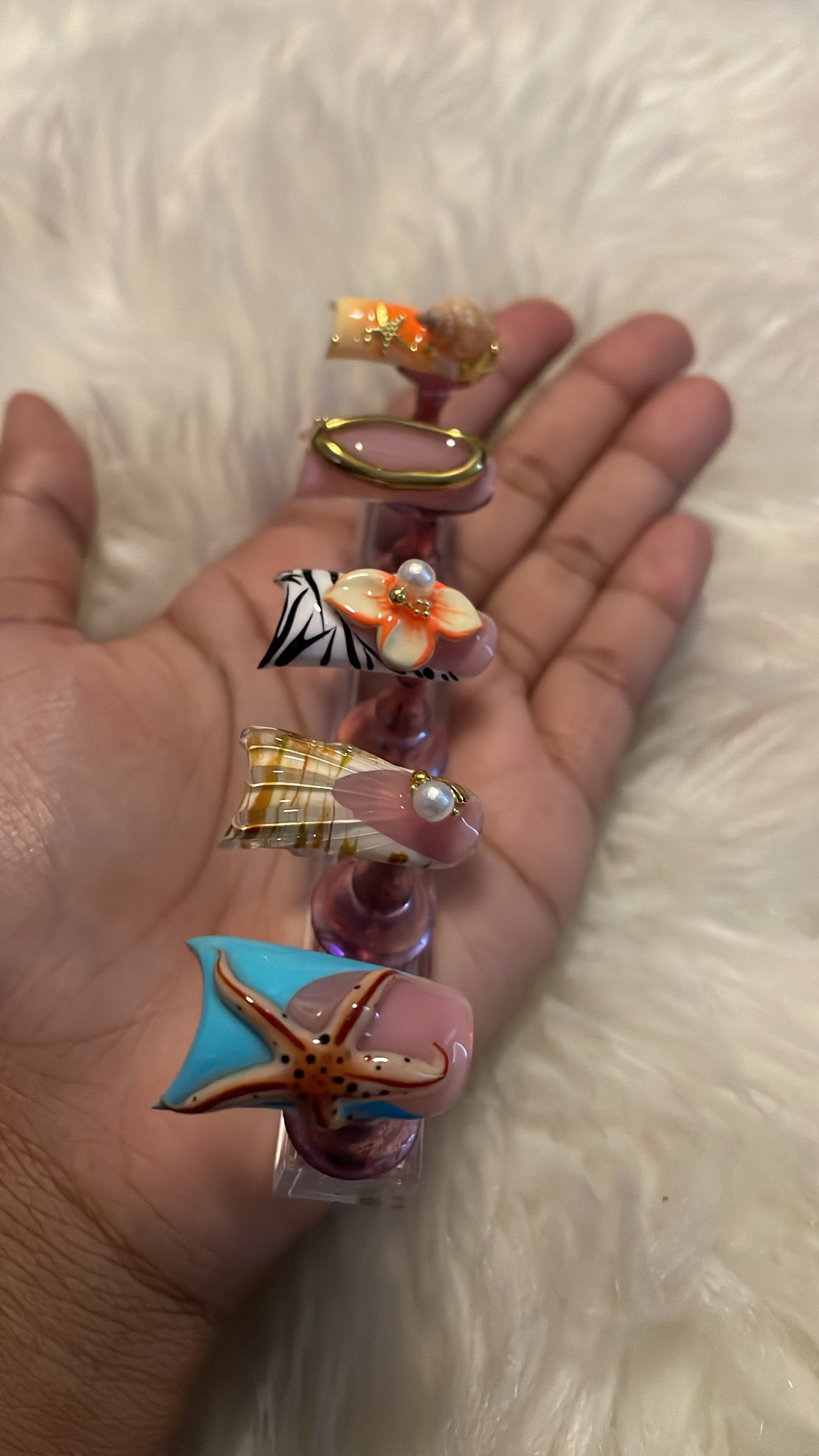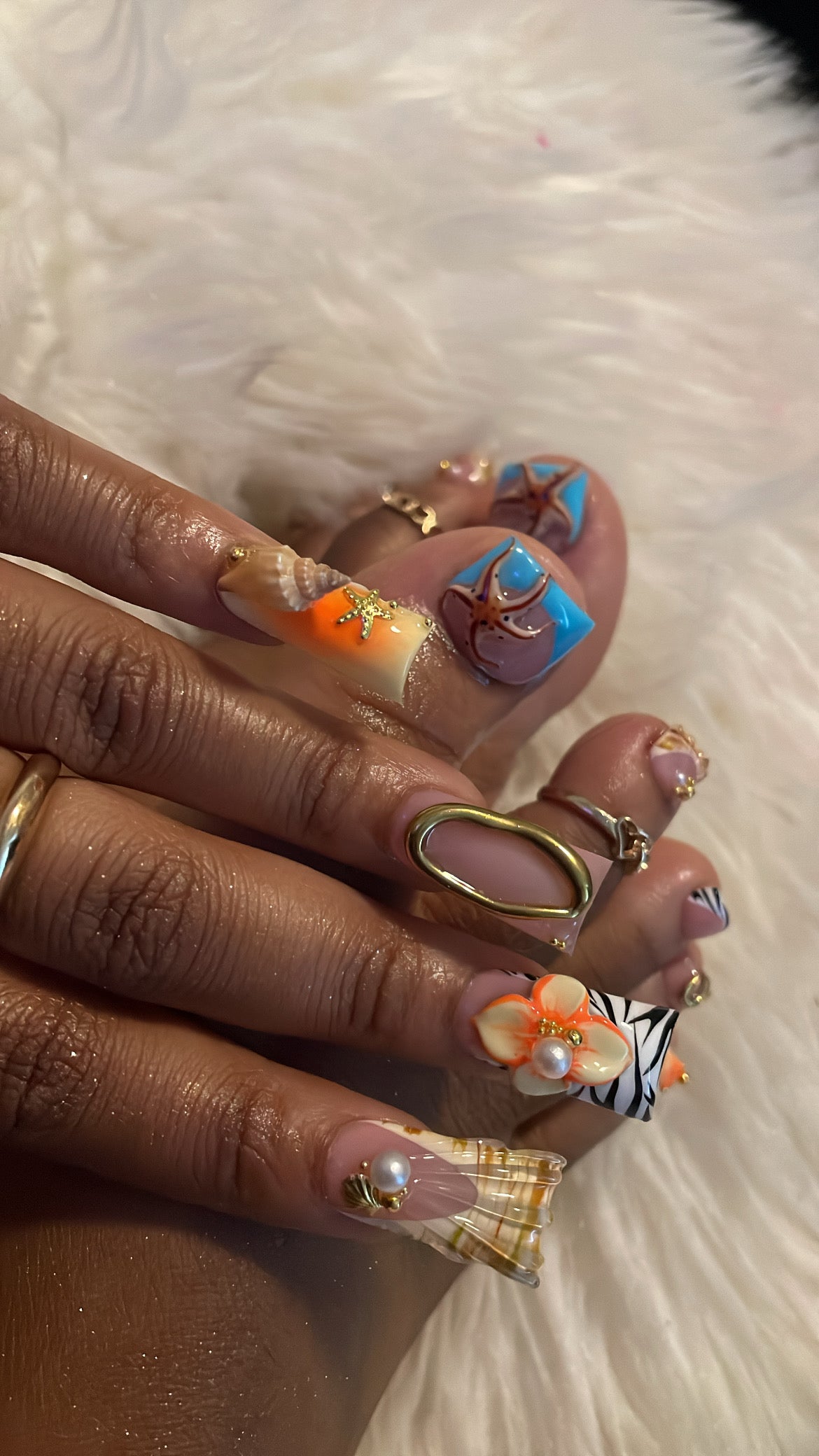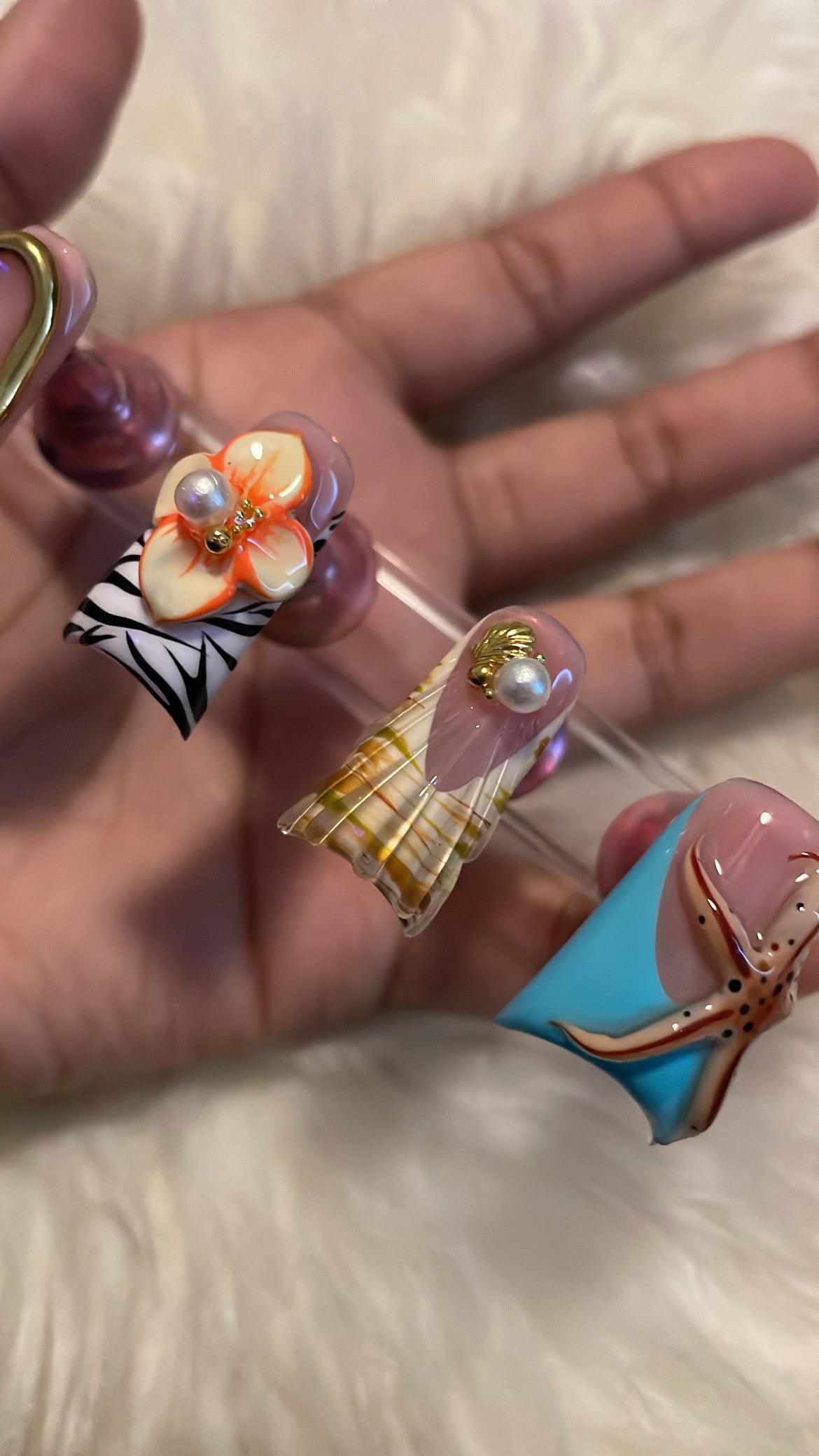 Get ready to escape with the Rode Trip nail set your passport to paradise! This vibrant, tropical inspired freestyle set features a mix of bright colors, zebra print accents, and shimmering gold accessories that channel beachside glam. Each nail is uniquely decorated with 3D starfish, seashells, and luxe tropical charm pieces, bringing major island vibes wherever you go.