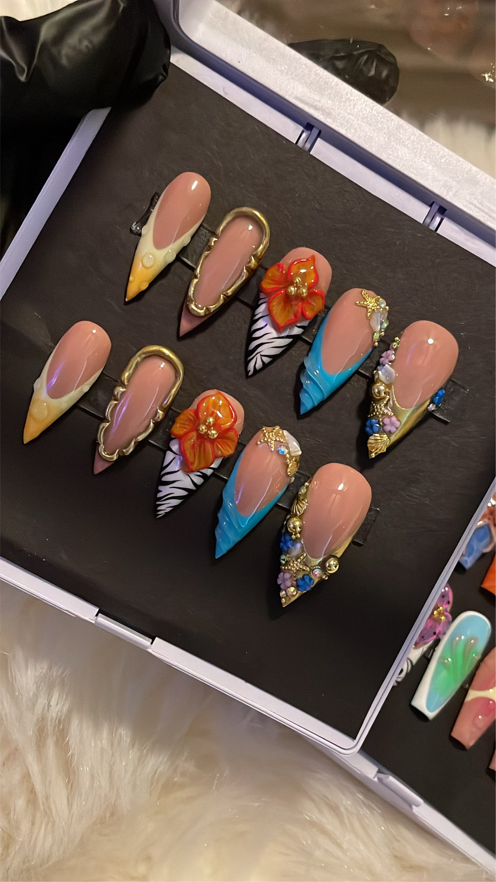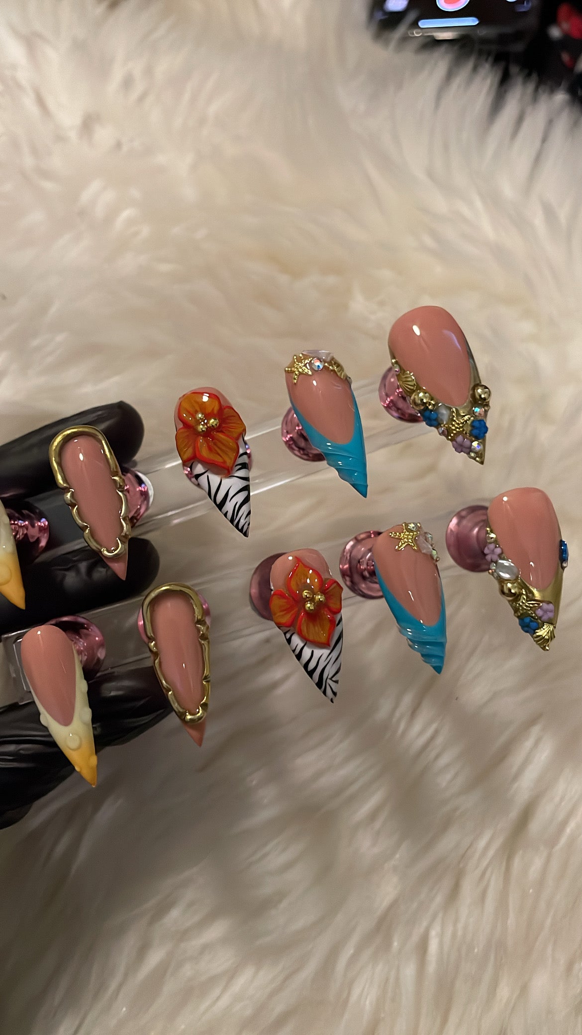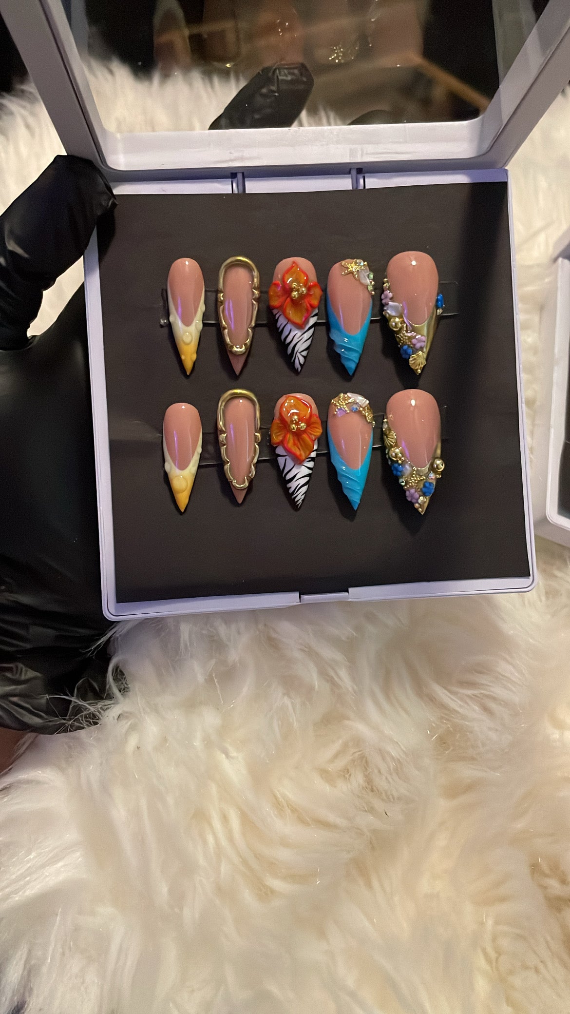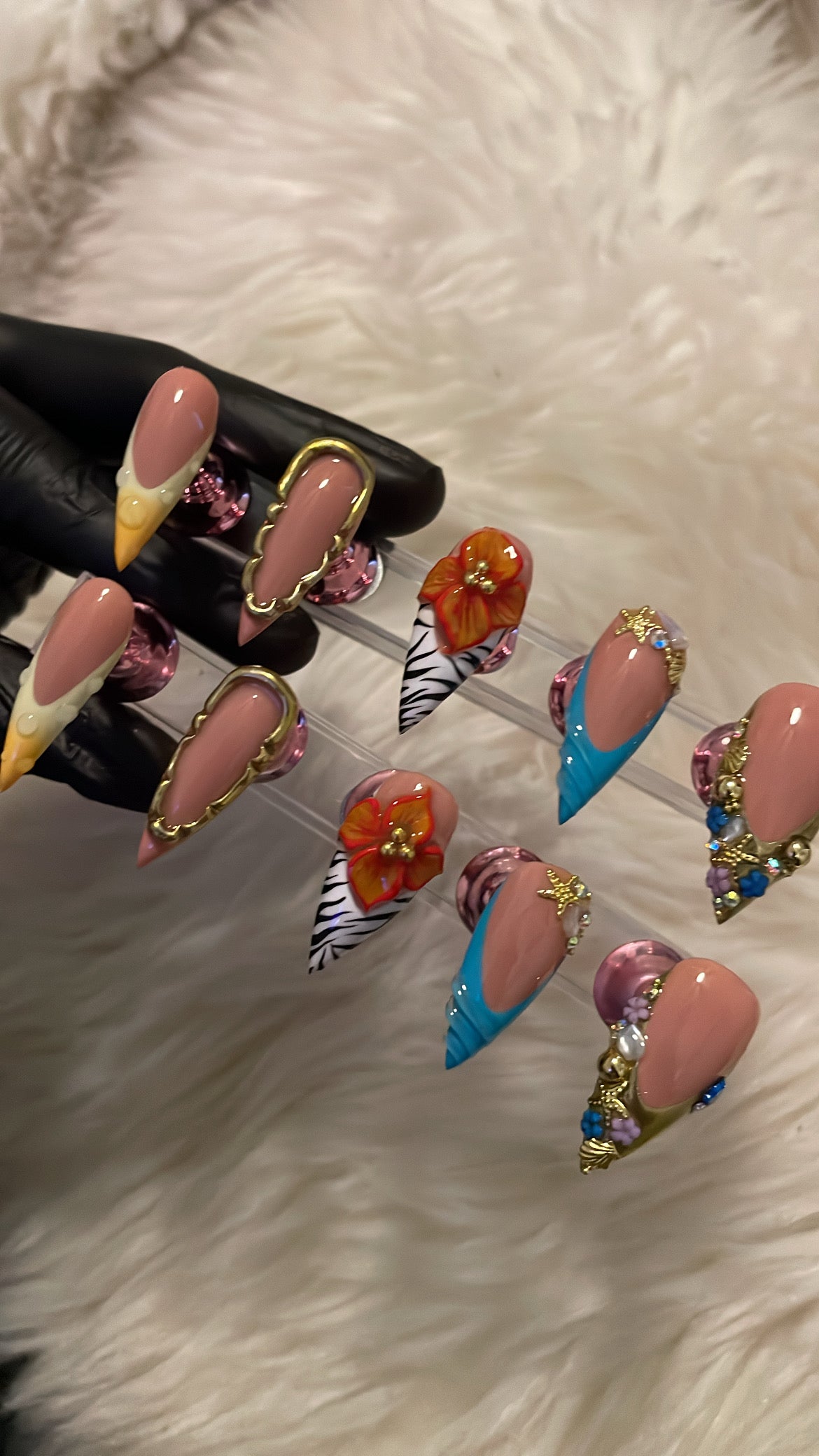 Turn heads with “Exotic”, a vibrant, high drama nail set designed to make a statement. This set features vibrant colors, eye catching zebra prints, and luxe gold elements and accessories that bring instant glam. Nails with detailed 3D flowers and bold imagery, giving it a rich, custom look that lives up to the name. From texture to color, Exotic is all about standing out with fierce, unapologetic style. Glam. Wild. Unforgettable.