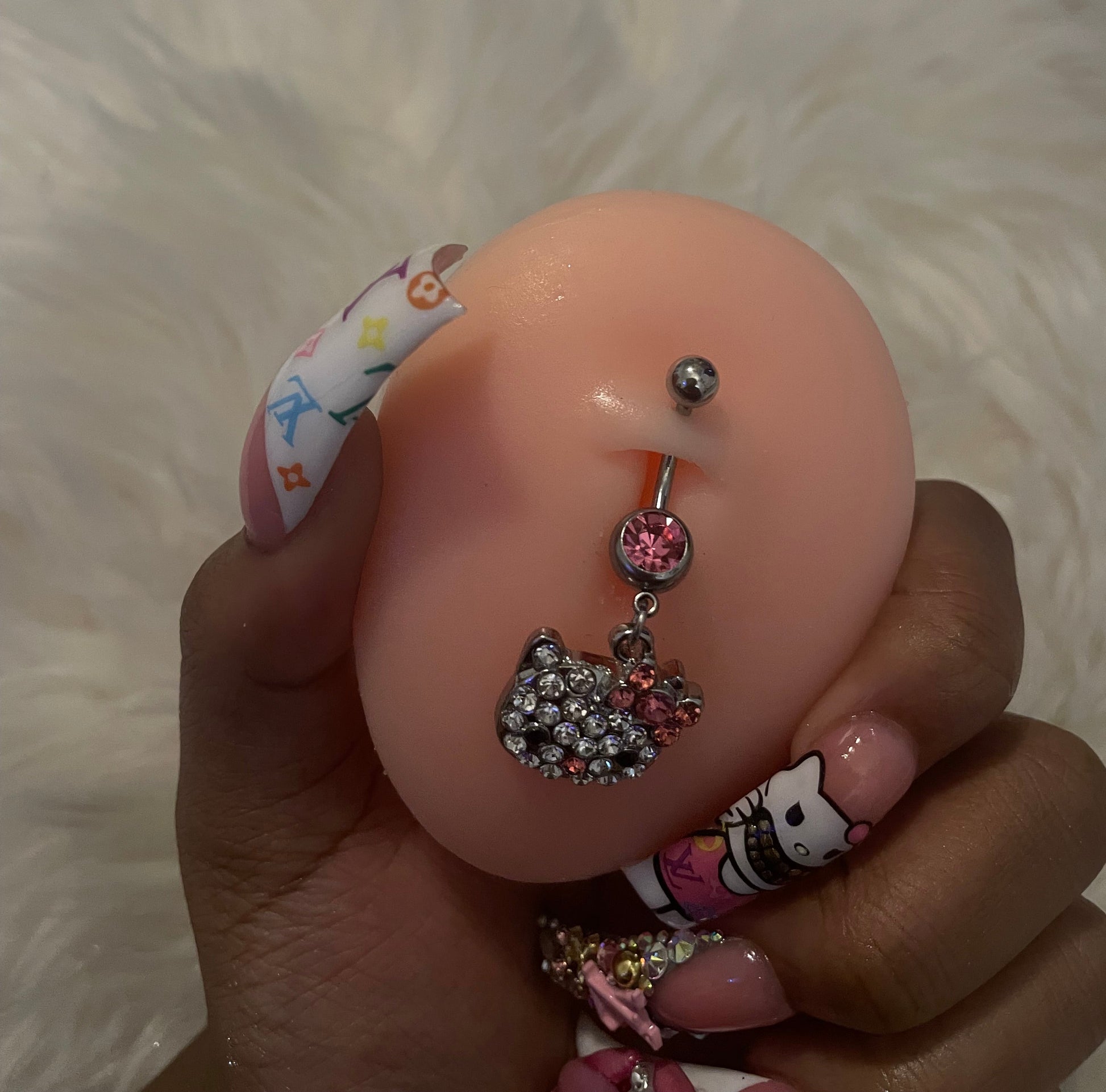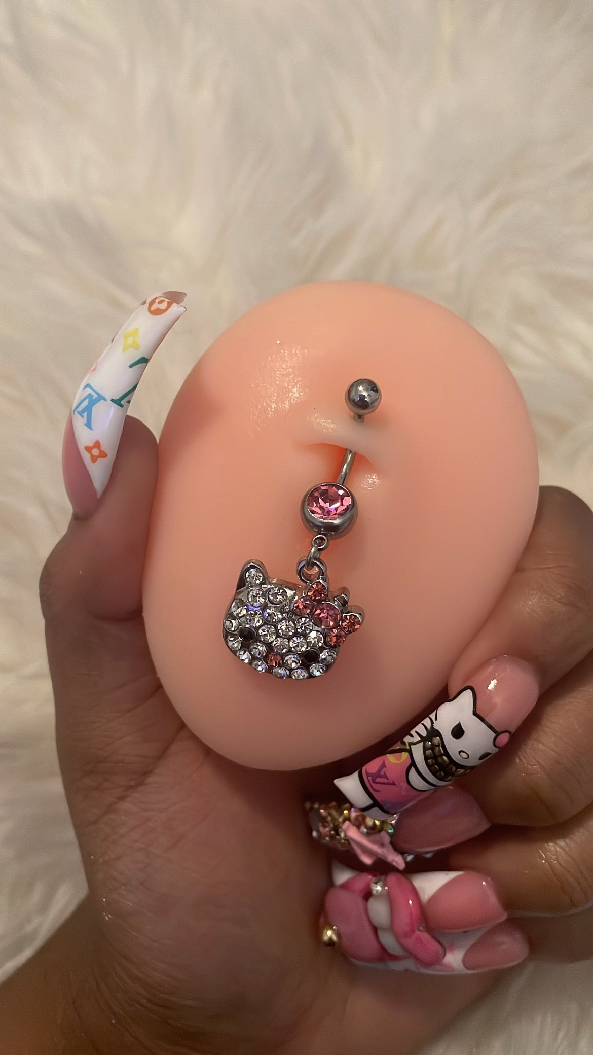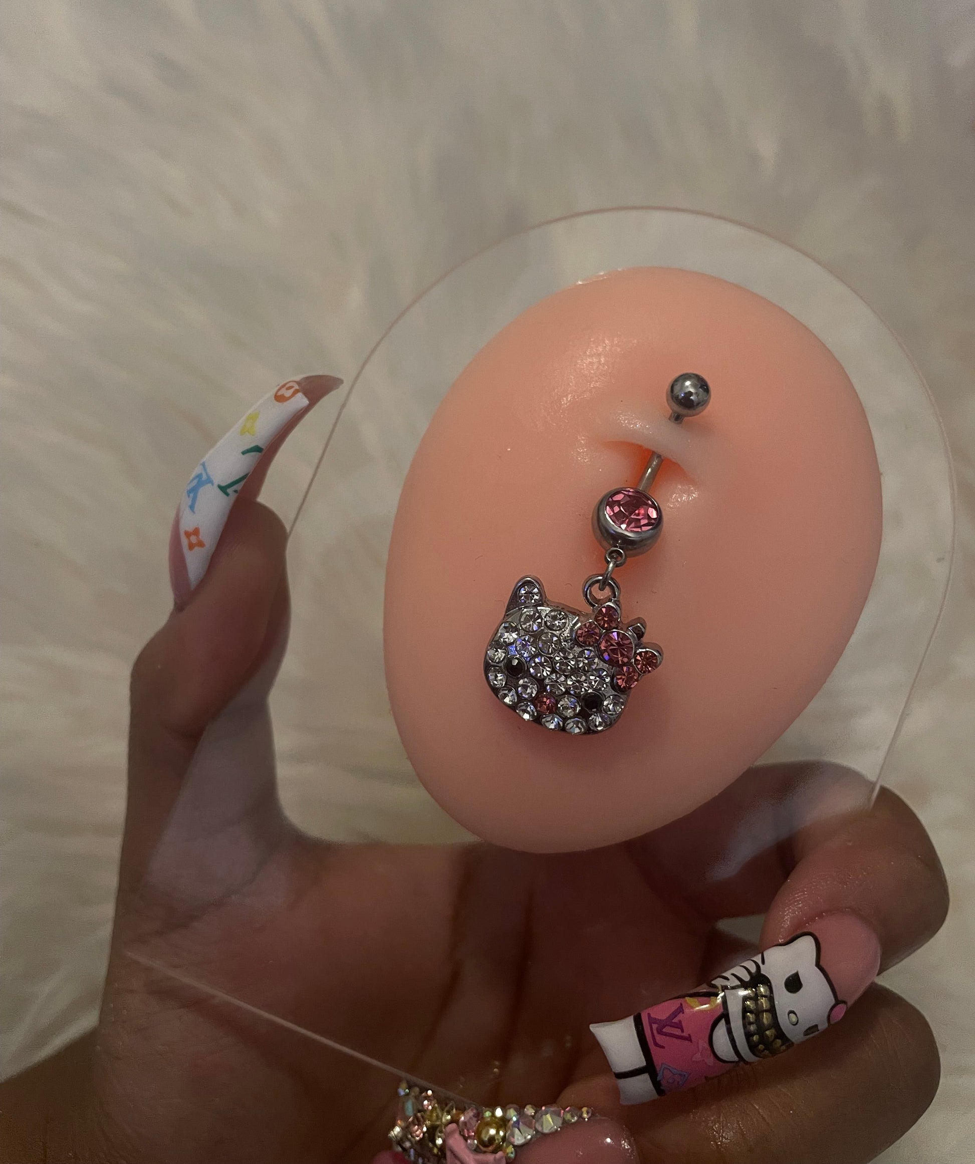 This belly ring features a cartoon cat face with a blinged out design. Subtle sparkle with a cute finish, perfect for fans of the iconic cartoon cat look.