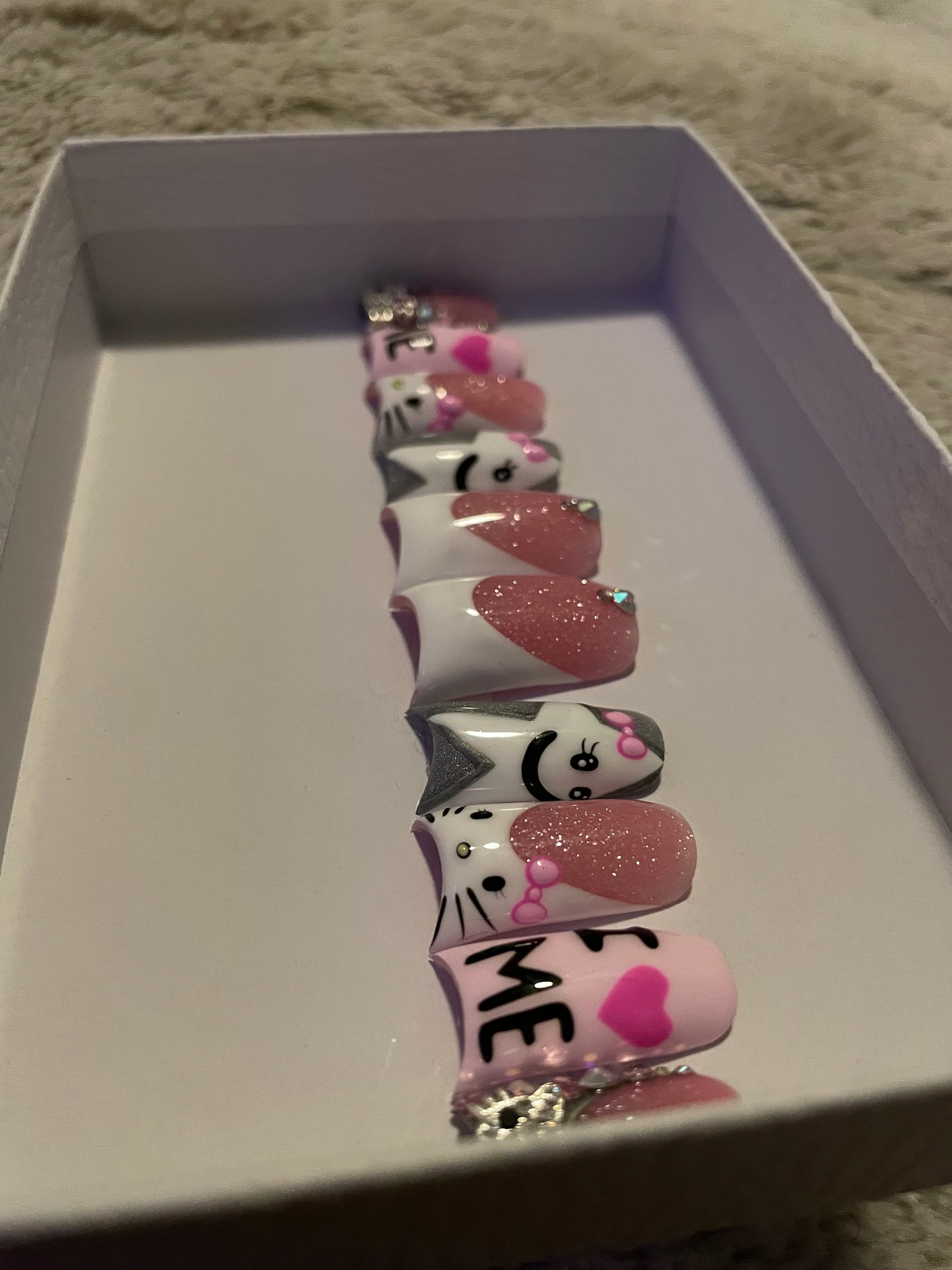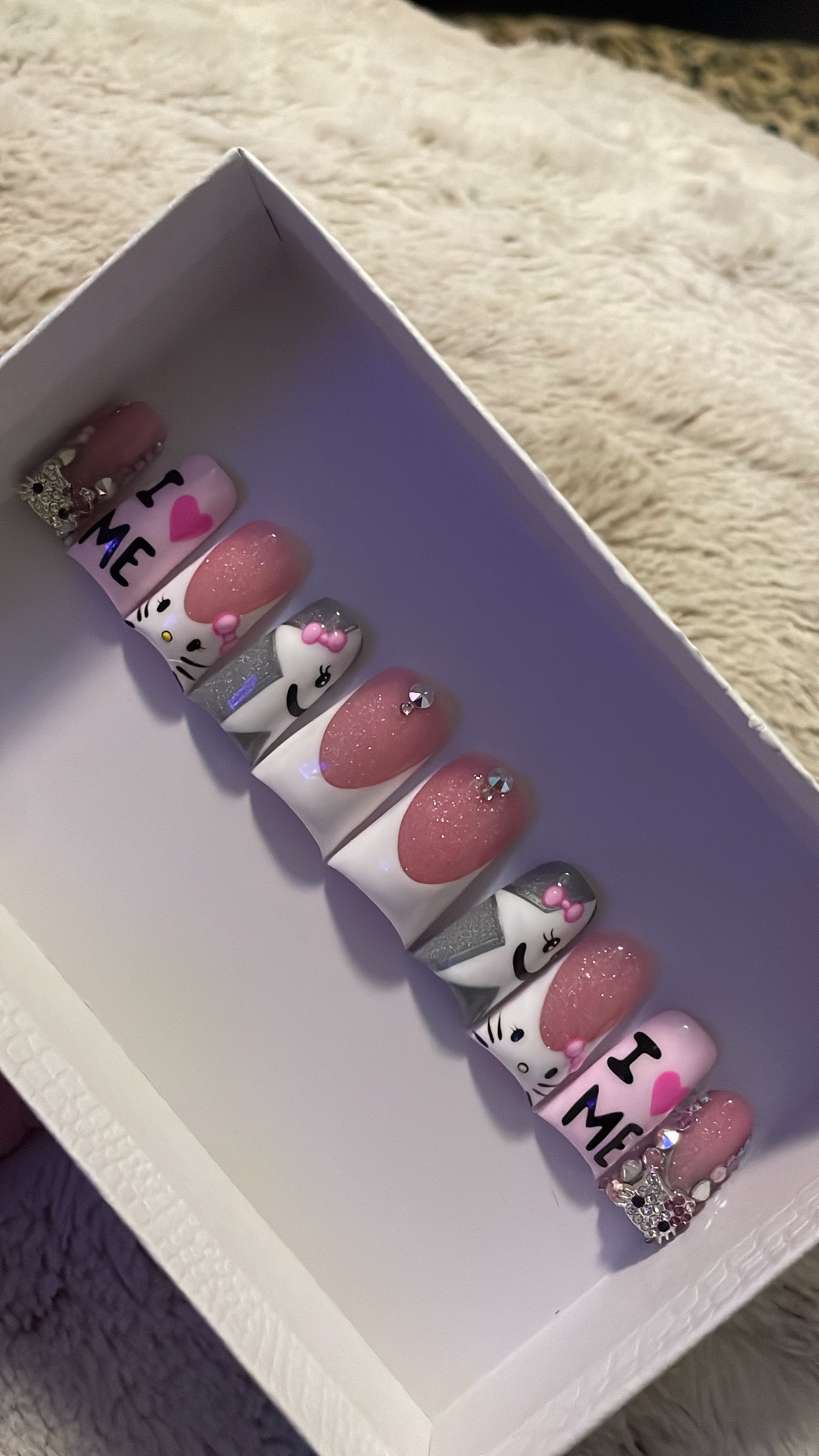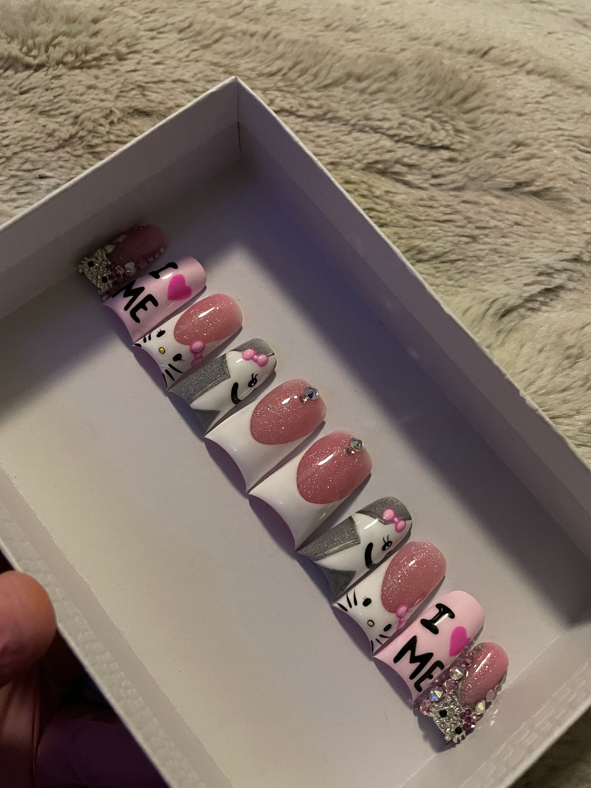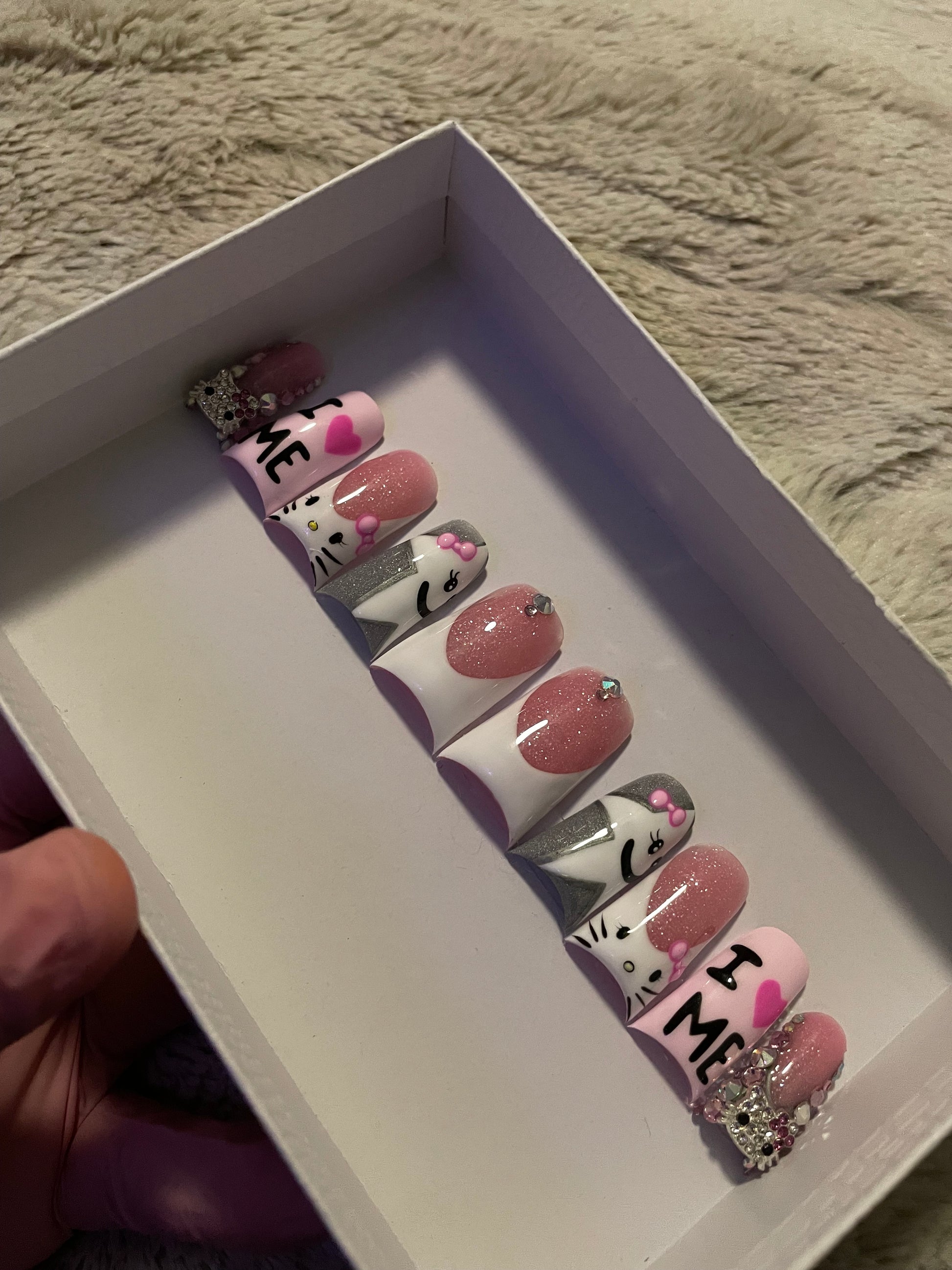 This playful and empowering nail set is all about self love and sparkle. Featuring a mix of French tips, bling, and Hello Kitty accents, each nail tells its own story: a thumb with a subtle French tip and bling, a star shaped Hello Kitty on a silver background, a Hello Kitty French tip, a soft pink nail declaring "Iš©·ME" with hot pinkĀ hearts, and a bling pinky topped with a Hello Kitty charm. Perfect for celebrating confidence, embracing self love, and adding a fun yet luxurious touch to your look.