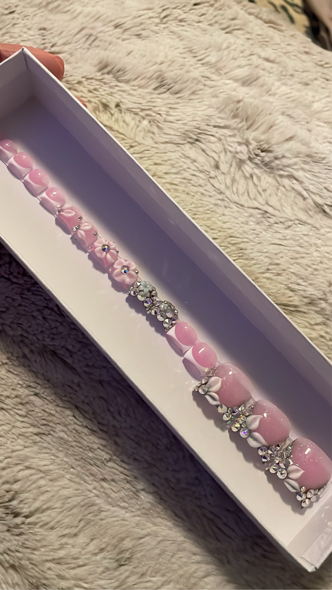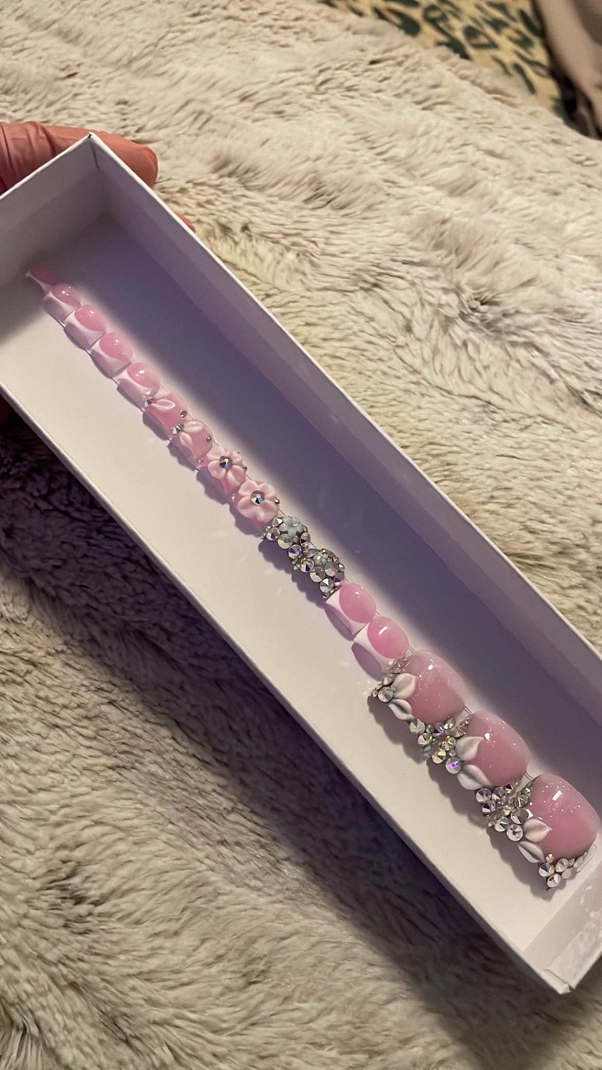 This glamorous press on toe set brings sparkle and elegance to every toe. Featuring a mix of bling, delicate flowers, and classic French tips, this white set is the perfect combination of chic, feminine, and luxurious. Each detail is thoughtfully designed to make your toes shine, whether for a special occasion or everyday glam.🪩 ✨😎