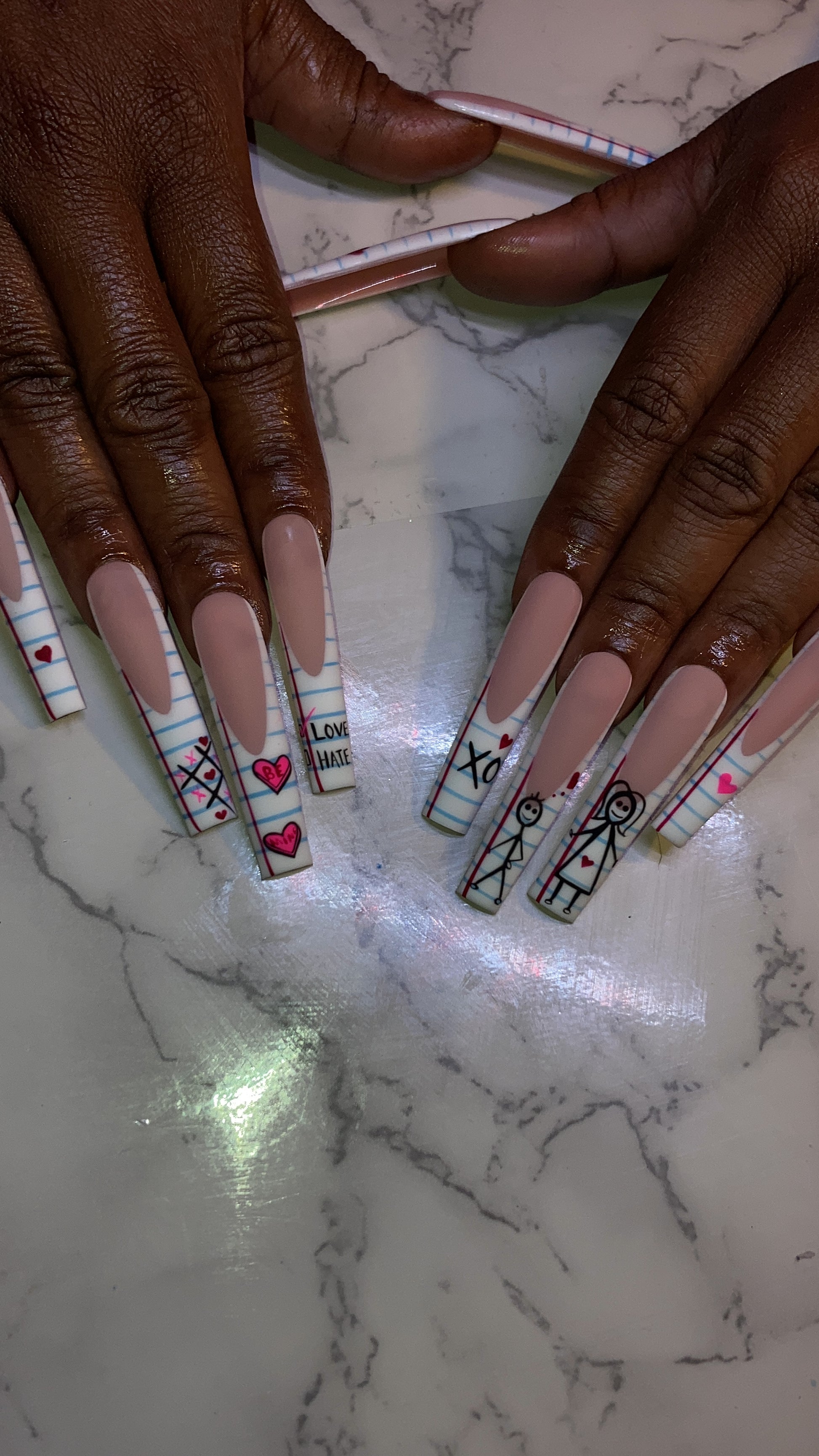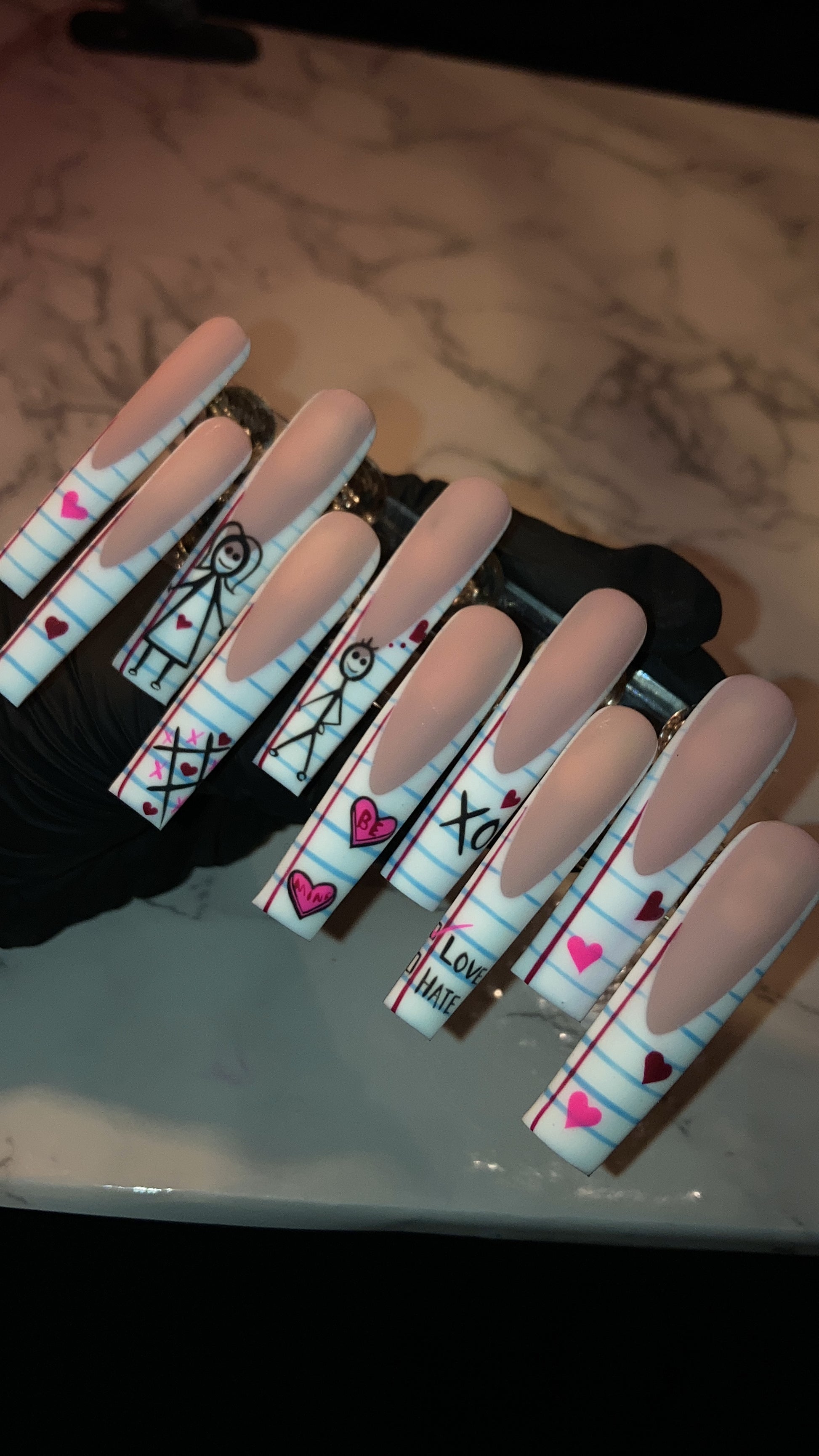 This playful, romantic nail set brings back the nostalgia of passing love notes in class. Designed on a soft white, notebook paper base with faint blue lines, features doodled stick figures, hearts, and flirty messages like "yes," "no," and "maybe so", just like the old school love quizzes. Pops of red, pink, and black ink style designs give it a handwritten charm. It's a dreamy, youthful set perfect for hopeless romantics and daydreamers alike.