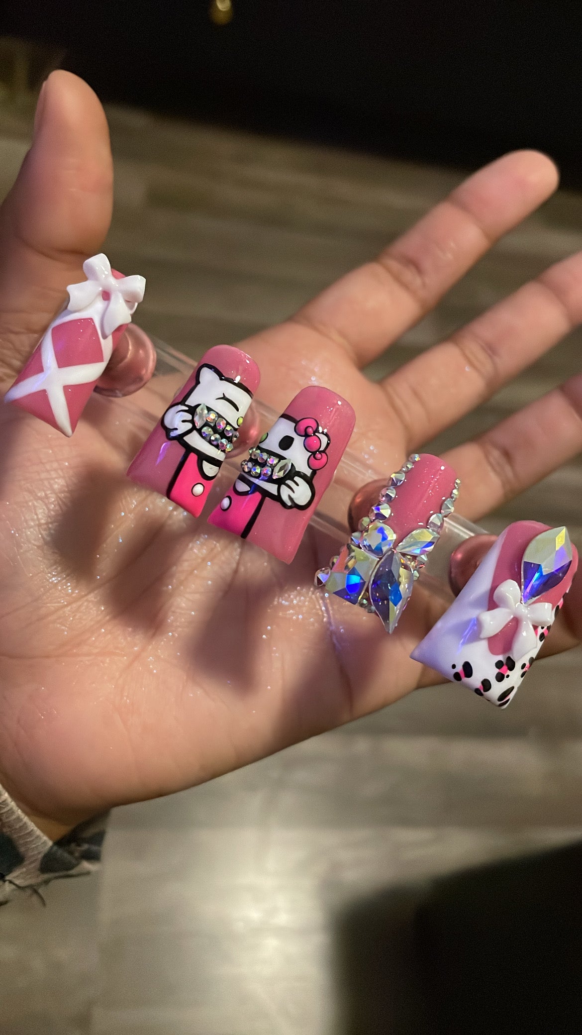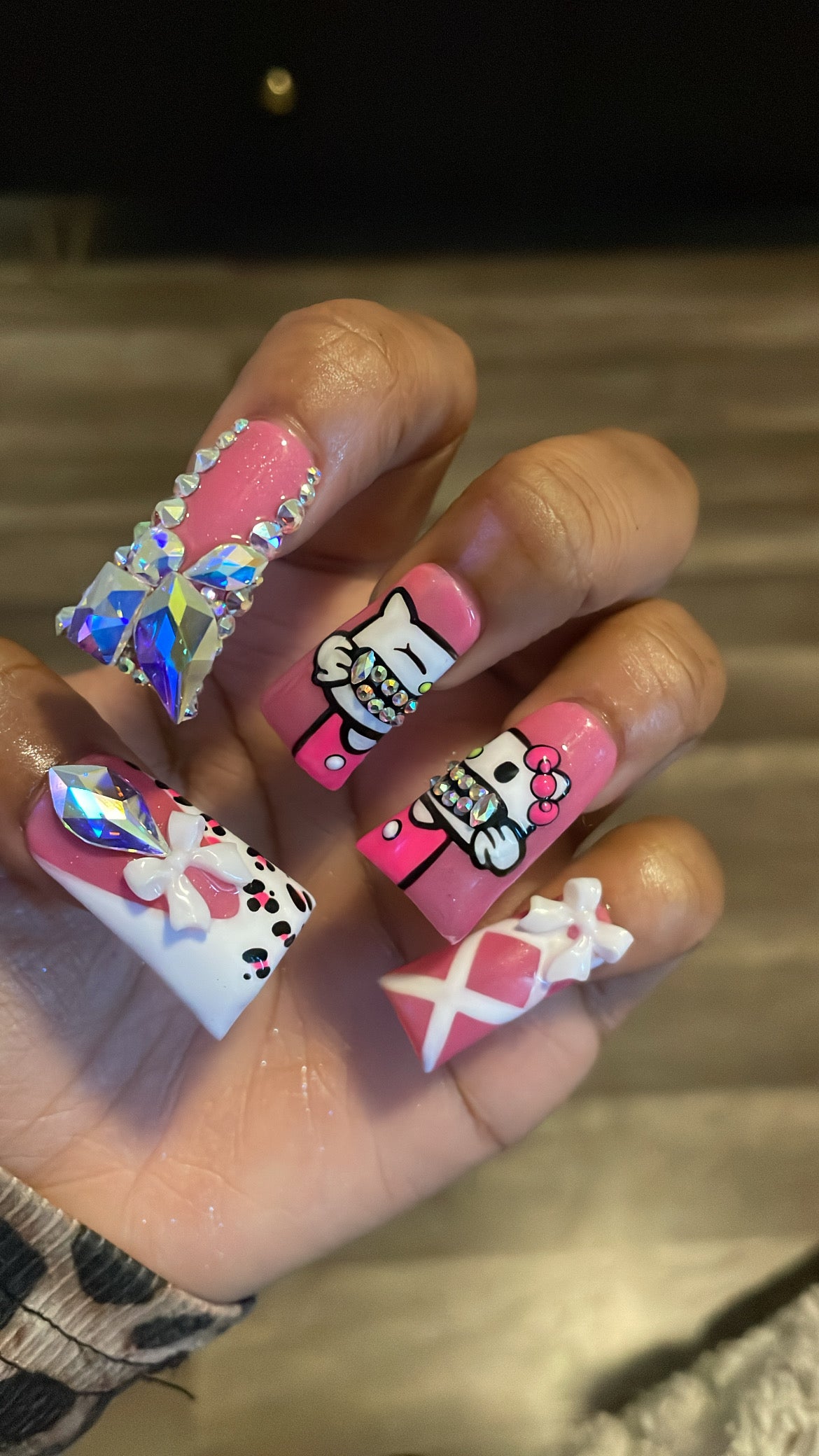“Diamond grillz” Is a 7 hour long hand painted Hello Kitty design that showcases meticulous artistry and bold creativity. Featuring vibrant pink and white tones, each nail offers its own statement. The middle and ring fingers highlight Hello Kitty character with AB diamond studded grills adding a glamorous and playful twist to the classic character.The set is accented with large iridescent rhinestones, 3D bows, and intricate detailing like leopard spots and gift wrap inspired striping creating a fun, luxe, and highly detailed look. Every element is carefully placed, reflecting the precision and time invested.