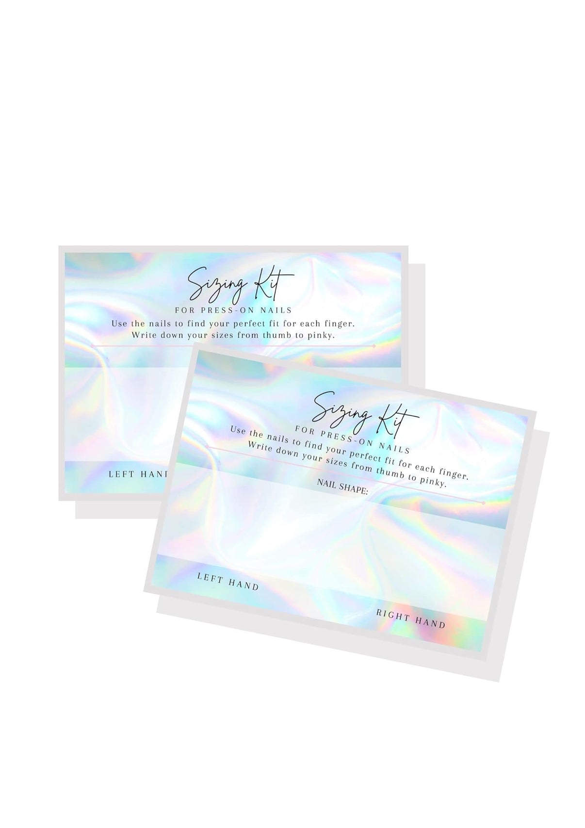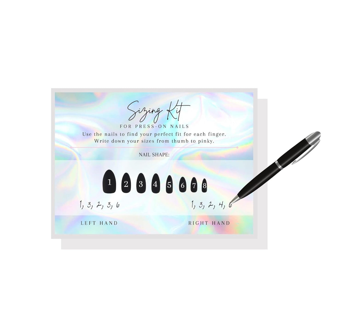 You'll receive a kit via mail with 10 different nail tip sizes. Simply try them on to find the perfect fit for each of your fingers on both hands. Then, write down your sizes and send a picture of your kit to us via email or Instagram DM.